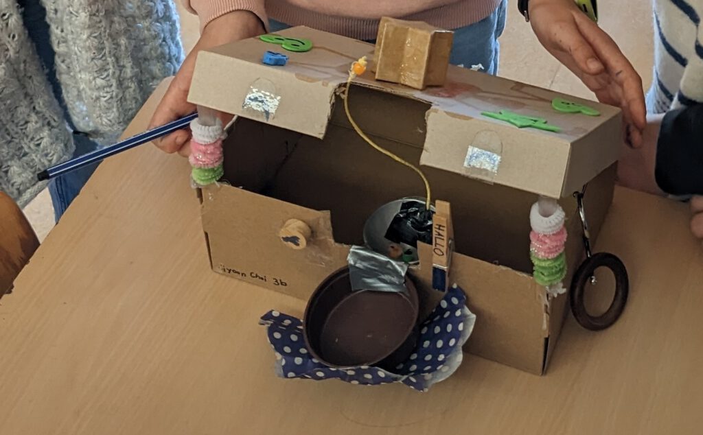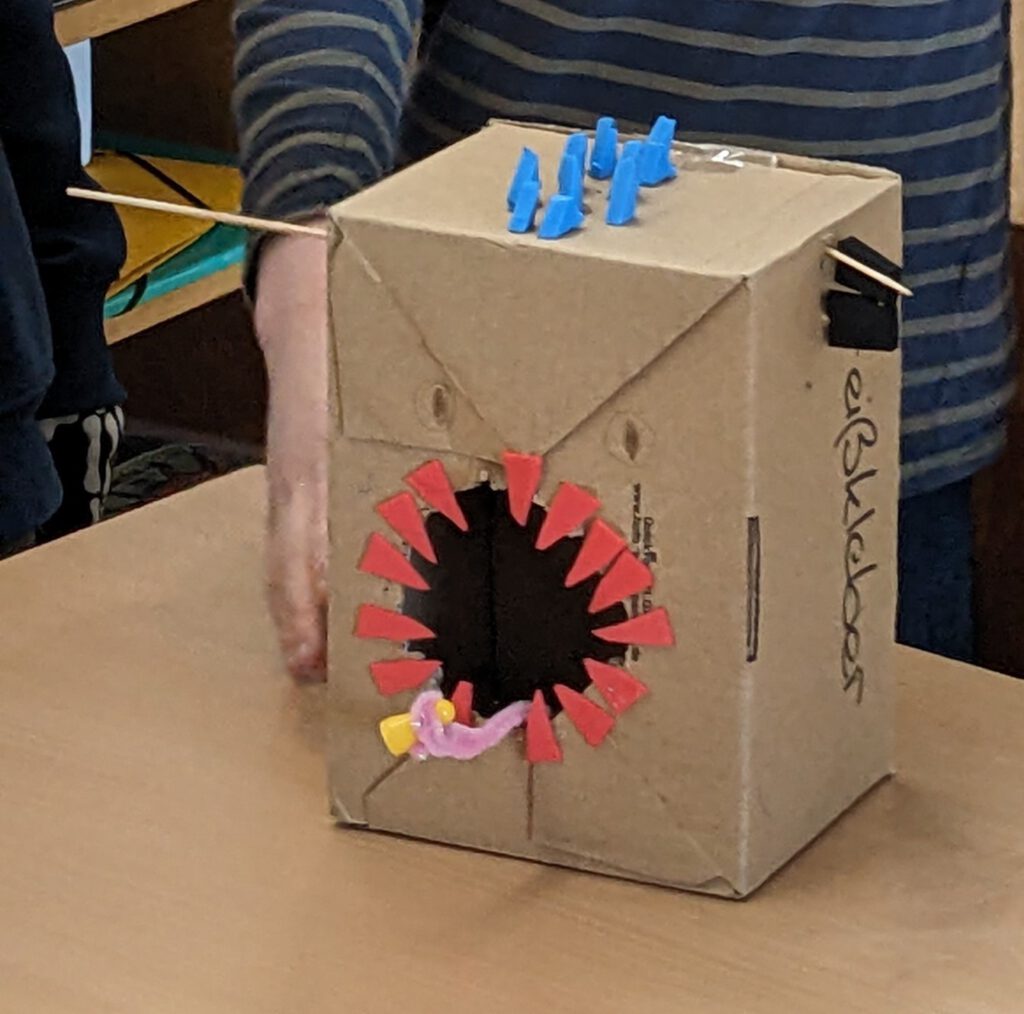 Beim Gerät von Suheyb und Samuel dreht man an einer Kurbel, sodass ein Morgenstern hochgezogen wird. Dann schiebt man eine Stange hinten hinein und der Morgenstern saust kurz aus dem Monstermaul heraus. Es gab Probleme dabei, die Schnur an der Kurbel zu befestigen.
