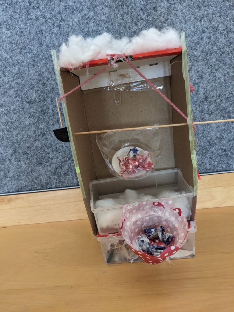 Bei dem Automaten von Jiyoon, Ivana und Antonia kann man mit einem Stift hinschreiben, welche Süßigkeiten man haben will. In einem Gefäß mit Schnur sind die Süßigkeiten und wenn man in einen Ring getroffen hat, kann man an der Schnur ziehen und die Süßigkeiten fallen in die andere Schüssel. Die Schüssel so zu befestigen, dass die Süßigkeiten in der anderen Schüssel landen, war schwierig.