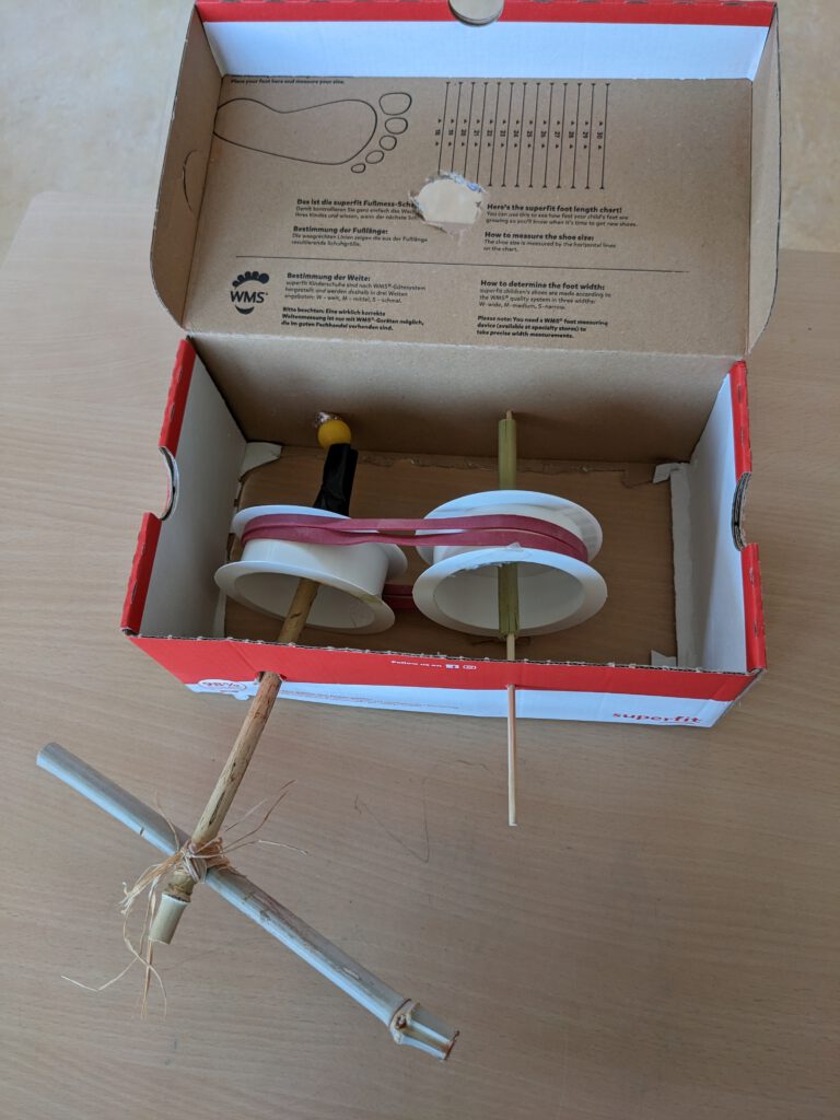 Entwickler der Maschine sind Luca, Oliver und Joni. Damit kann eine Murmel weiter-transportiert werden. Zuerst kommt die Murmel auf einen Übergang, anschließend in eine Rinne und dann in eine Vase. Es dauerte lange, die Räder und Gummis richtig anzubringen.