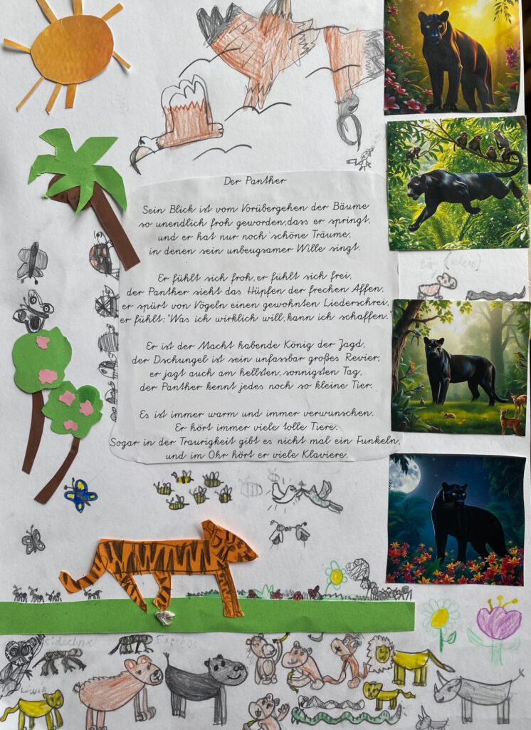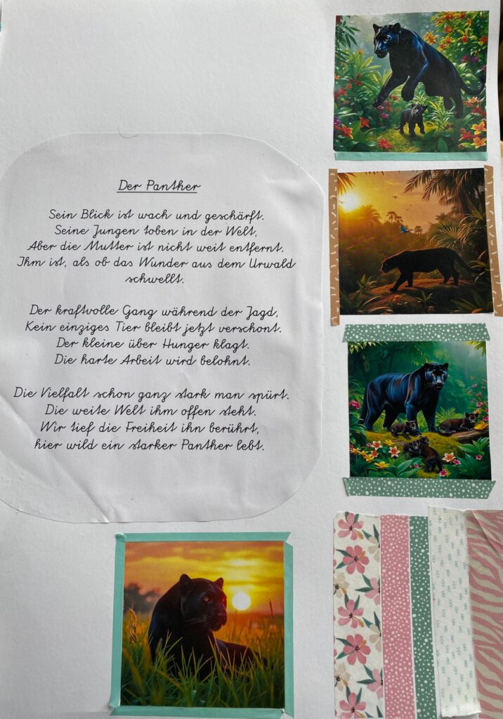 „In der AG Literatur haben wir das Gedicht ‚Der Panther‘ von Rainer Maria Rilke durchgenommen. Es geht in diesem Gedicht um einen eingesperrten Panther, der in einem Käfig leiden muss. Wir haben das Werk von Rainer Maria Rilke umgedichtet. Jetzt haben die Strophen einen Inhalt, in dem kein eingesperrter Panther vorkommt, sondern eine freie Wildkatze, die im Dschungel ihr Unwesen treibt. Als wir mit den Gedichten fertig waren, haben wir in unseren Gruppen Bilder mit der SchulKI erstellt. Danach haben wir die Gedichte auf dem Computer abgetippt und ausgedruckt, sodass wir tolle Plakate gestalten konnten.