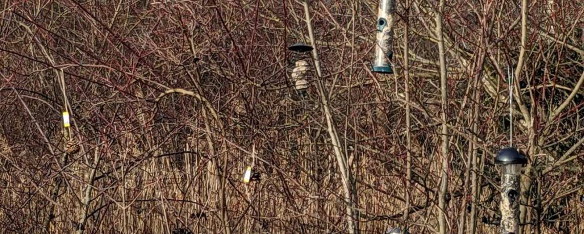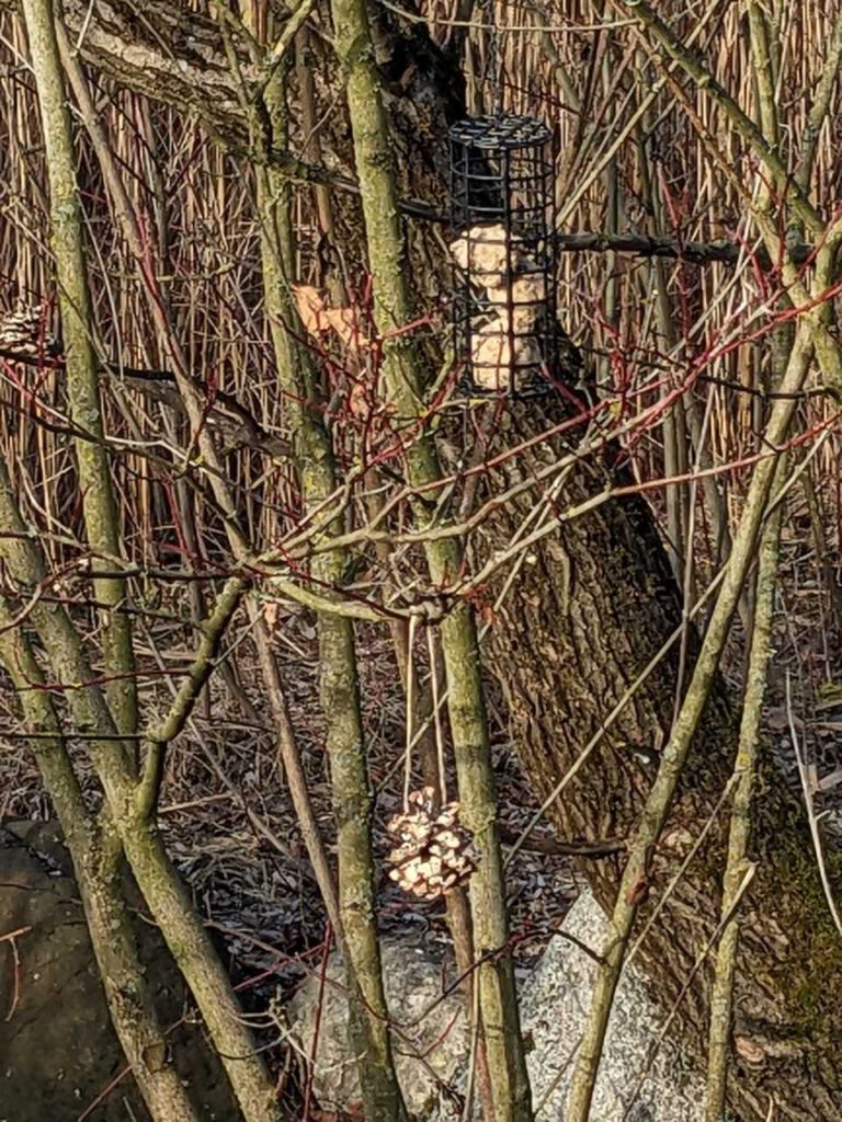 Wir haben Krähen, Elstern und Kohlmeisen gesehen. Die Futterstellen sind groß genug für alle Vögel. Sie können in Ruhe essen, weil außenrum viele Büsche und Bäume sind. Sie müssen dann keine Angst mehr haben. (Anna, Stella)