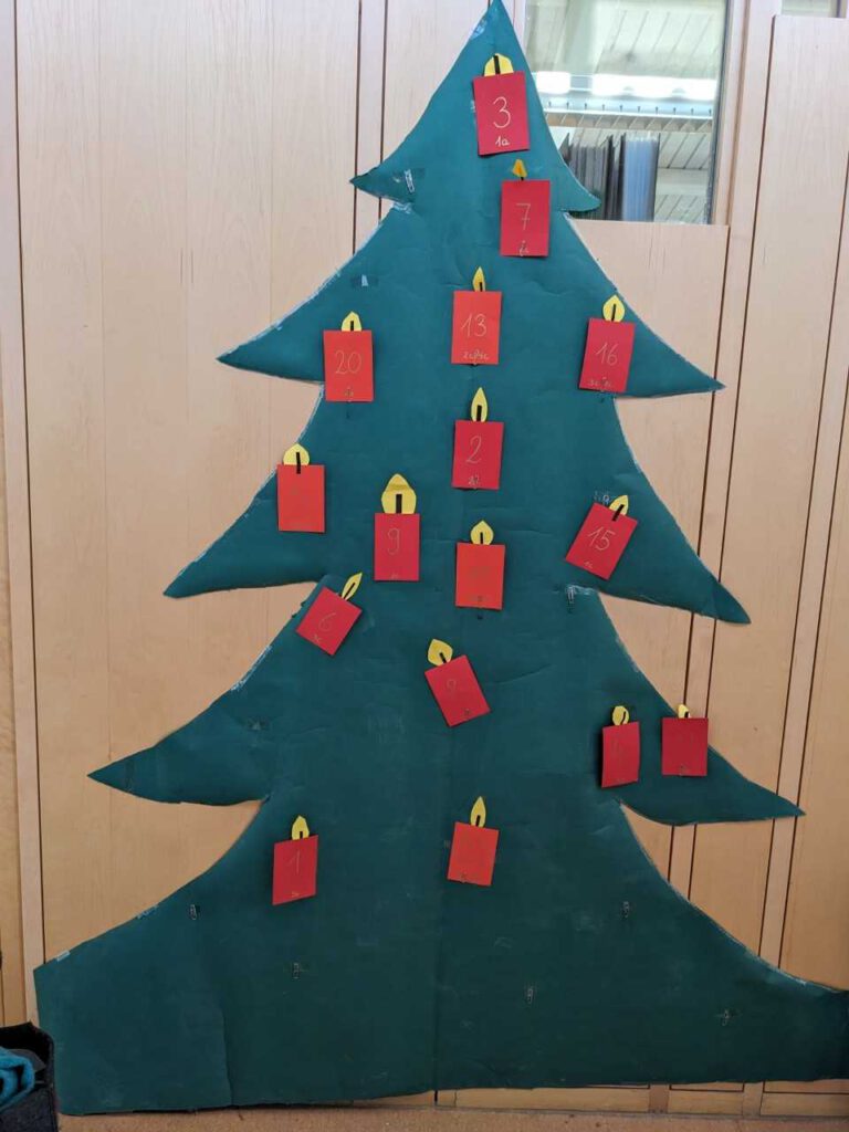 Wir haben einen eigenen Kalender gestaltet. Weil wir an der Schäferwiese keinen Weihnachtsbaum kaufen, haben wir uns gedacht, dass wir den Kalender als Weihnachtsbaum gestalten. Wir haben uns umweltfreundliche Aufgaben ausgedacht wie z. B. „Baut ein Vogelhaus mit eurer Klasse.“
