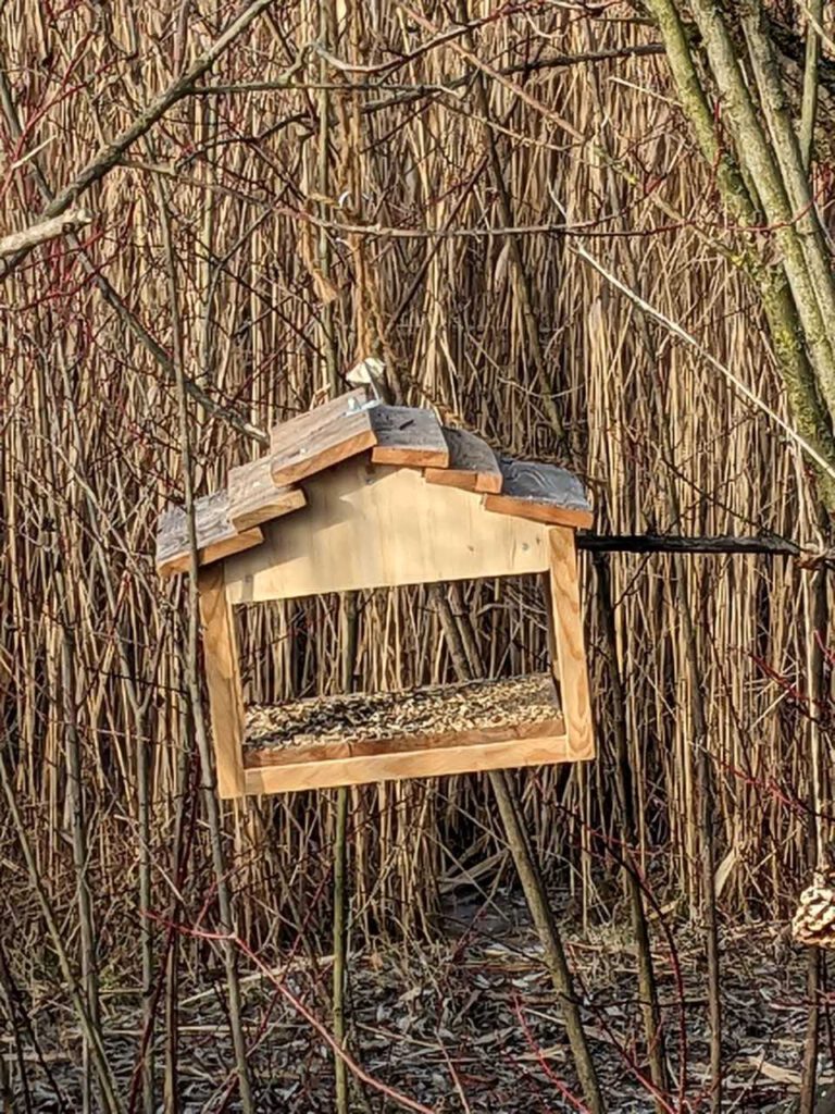 Wir haben am 1. Dezember den Auftrag bekommen, ein großes Vogelhaus zu bauen. Ein paar von uns sollten die Teile schleifen, andere schraubten die Teile dann zusammen. Währenddessen wurde das Dach gesägt. Schließlich war das Vogelhaus fertig und wir haben es aufgehängt. (Friedrich, Levi)