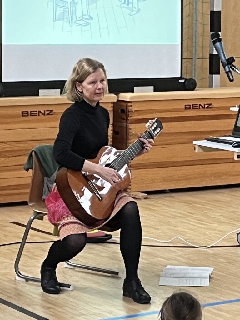 Sie erklärte zudem, welche besondere Bedeutung das Cover eines Buches hat und wie die Absprache mit dem Illustrator Jens Rassmus genau ablief. Außerdem griff sie auch selbst zwischendurch zur Gitarre und sang mit dem begeisterten Publikum ein schwungvolles Lied. Obgleich es in dem Buch „Reißaus mit Krabbenbrötchen“ zu Beginn um die Frage geht, ob Langeweile nicht auch einmal eine gute Sache sein kann, darf man sicher sagen: Den Kindern unserer Schule war es während der Lesung sicherlich keine Minute langweilig!