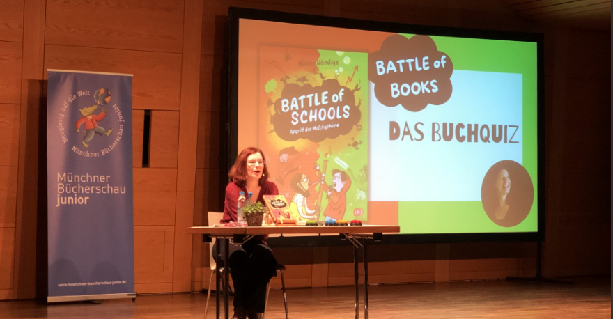 Am 05.März 2024 haben wir, die Klassen 4a und 4d, am Gasteig im Zuge der Münchner Büchershow Junior eine Lesung besucht. Das Buch hieß „Battle of Schools“ und wurde von der Hamburgerin Autorin Nicole Röndigs geschrieben und auch vorgestellt. Allein den Titel und das Buchcover fand ich schon ziemlich cool. Gespannt auf die Geschichte klebte ich der Autorin an den Lippen, als sie die Geschichte grob vorstellte. Anschließend las sie uns ein Kapitel vor – auch meine Sitznachbarin und die Lehrerinnen musste an vielen Stellen kichern. Nach dem Vorlesen gab es ein Quiz, bei dem unsere Klassensprecher Fragen zu Büchern beantworten mussten. Wie auch im Buch spielten die einzelnen Schulen gegeneinander und tatsächlich hat unsere Schule den ersten Platz belegt! Ultra cool! Neben Medaillen bekamen wir auch ein Exemplar „Battle of Schools“ für unsere Schulbibliothek. Am Schluss durften wir uns selbst noch ein Buch kaufen. Ein Autogramm habe ich mir auch noch geben lassen. Nach der tollen Lesung sind wir dann mit der S-Bahn wieder in Richtung Schäferwiese gefahren, doch Unterricht hatten wir (zum Glück!) heute nicht mehr.