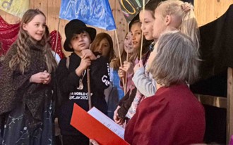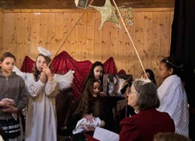 Im Zehentstadel: Zusammen mit den Chorkindern haben wir am 7.12. 2024 unser Krippenspiel aufgeführt. Wir waren auf einer kleinen Bühne und hatte viele Zuschauer. Es spielten Maria und Josef, fünf Hirten, vier Wirte und zwei Engel mit. Der Chor unterstützte uns bei den vielen Liedern. Wir hatten selbst gebastelte Requisiten und schöne Kostüme an. Die Proben und die Aufführungen haben uns viel Spaß gemacht.