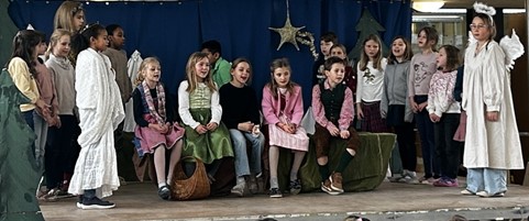 In der Schule: Unseren letzten Auftritt hatten wir am 16.12.2024 auf der schönen Bühne in der Aula. Der Chor unterstützte uns. Wir haben dort zwei Mal das Krippenspiel aufgeführt. Das Bühnenbild haben wir selber entworfen. Die Zuschauer hatten viel Spaß. (Ida Werle, 4b)