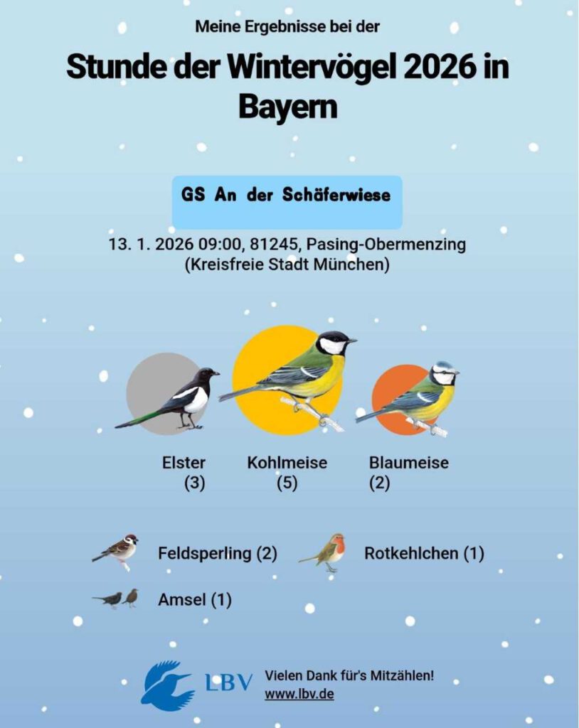 Bei der „Schulstunde der Wintervögel“ des Landesbund für Vogel- und Naturschutz (LBV) herrschte reges Treiben an der großen Futterstelle an unserem Teich. Damit wir ganz nah rankamen, hatten wir uns Sichtschutzwände mit Gucklöchern gebaut. Drei Klassen nahmen an der Aktion teil, sechs verschiedene Vogelarten konnten wir zählen. Zur Vorbereitung schulten wir die Kinder in Artenkenntnis und büffelten die Vogelnamen mit den Bestimmungsblättern, die uns der LBV geschickt hatte. Damit endet unser Einsatz für mehr Artenkenntnis aber noch nicht. Bis zum Sommerfest, so unser ehrgeiziges Ziel, sind alle Schülerinnen und Schüler so fit, um bei einem großen Vogelquiz gegen die Eltern erfolgreich antreten können.