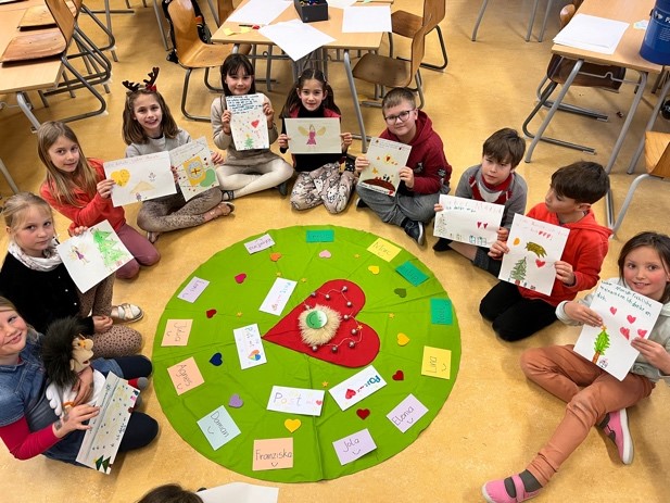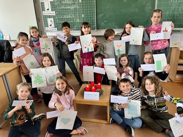 Die Pausenengel stellen sich vor, wie die Gesichter wohl strahlen, wenn alte Menschen oder Menschen mit körperlicher oder geistiger Einschränkung ihre Post mit Herz erhalten. Diese leben in Einrichtungen und bekommen keinen oder nur wenig Besuch. Deshalb schreiben wir zum Beispiel: „Lieber Mensch, wir denken an dich! Hast du auch ein Lieblingslied an Weihnachten? Ich male für dich einen Christbaum. Schön, dass es dich gibt…“ etc.